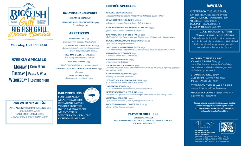 4pm-9pmBig Fish Dinner Specials 4/16/2026Thursday, April 16th, 2026