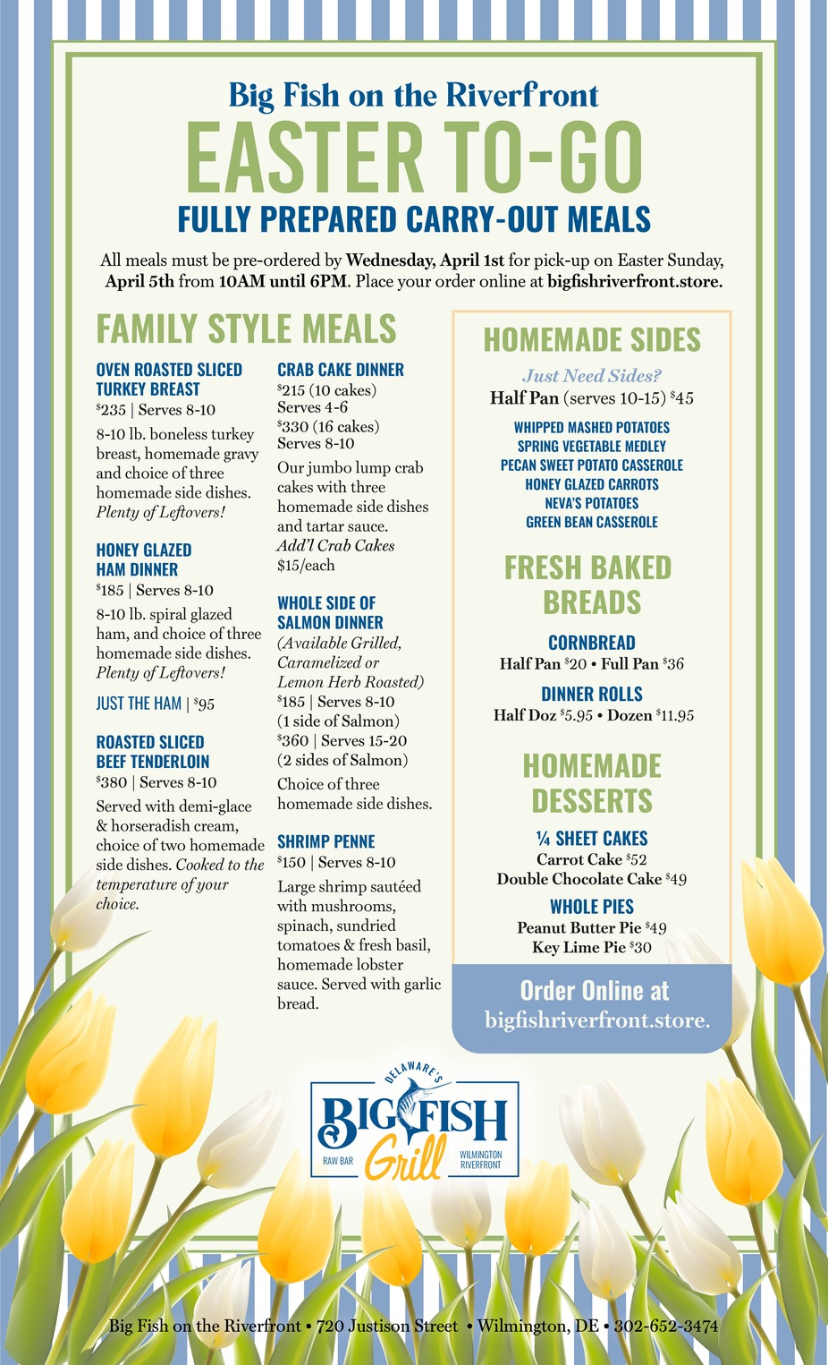 Order your fully prepared family meal by Wednesday, April 1 for pick-up on Easter Sunday, 4/1 from 10:00am-6:00pm. Order online at bigfishriverfront.store.
